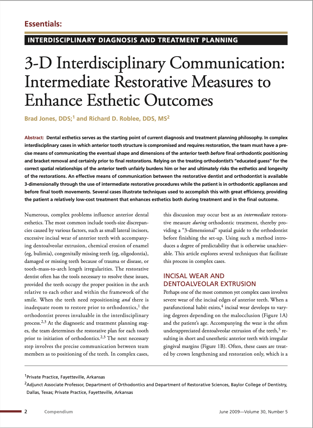 Articles 3-D Interdisciplinary Communication:Intermediate Restorative Measures toEnhance Esthetic Outcomes Evolution of Aesthetic Dentistry Origins of Dental Crowding and Malocclusions: An Anthropological Perspective Surgically Facilitated Orthodontic Therapy: A New Tool for Optimal Interdisciplinary Results Surgically Facilitated OrthodonticTherapy (SFOT): Maximizing CaseOutcome